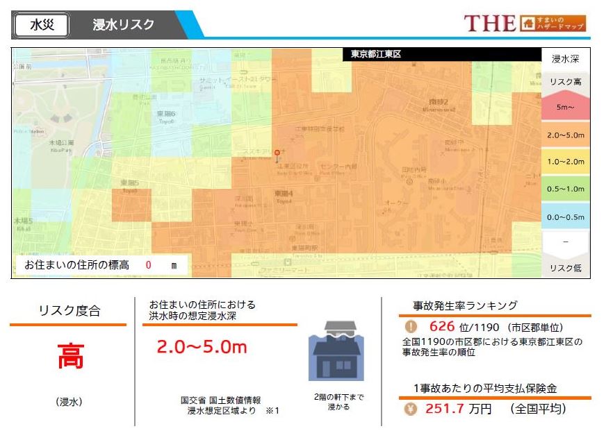 災害への必要最低限の備えであるハザードマップは、インターネットや行政機関などから入手可能ですが、日税サービスが提供する「オリジナル ハザードマップ」(損保ジャパン社データ)は、参照したい住所の状況をピンポイントで表示するとともに、保険会社が保有するその地域の保険金支払実績から危険度をビジュアルに示します。災害対策の一助としてご活用ください。