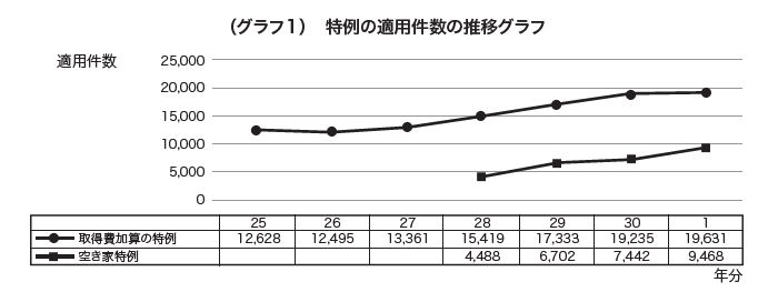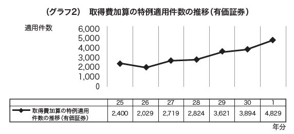 なお、同特例は株式等の有価証券でも適用されるが、平成26年以降、有価証券の売却に伴う取得費加算の特例の適用件数も増加傾向にある(グラフ2参照)。