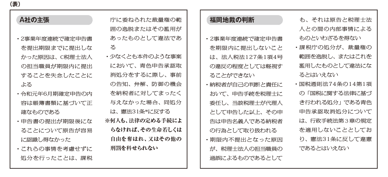 これを受けて課税庁は、A社の期限後申告は法人税法127条1項4号※に該当するとして、法人税の青色申告承認取消処分を行ったことから、A社が処分の取り消しを求めて争いとなった。