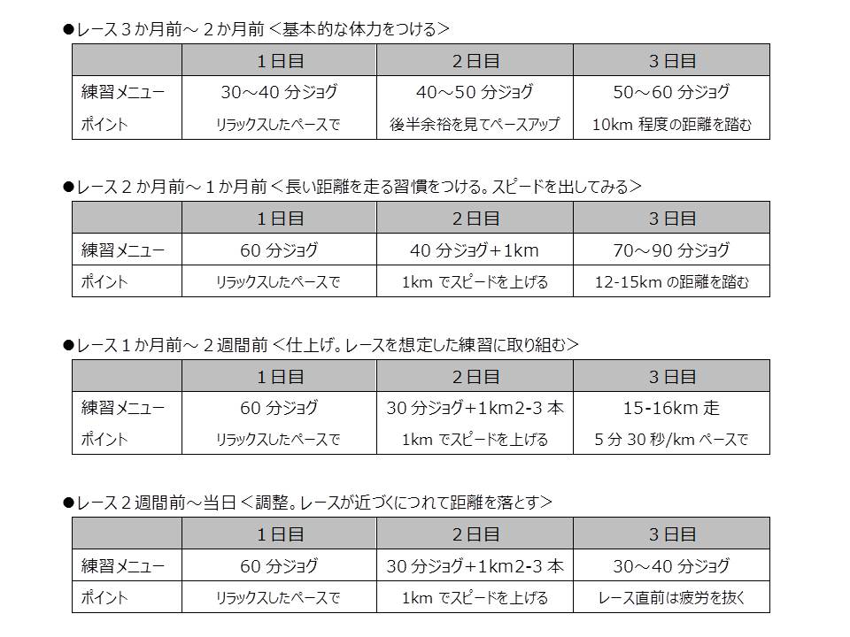 次項にて練習メニューを記載しますが、全て『ジョグ』を基本としており、これまでお伝えした「インターバル走」等のポイント練習は基本的に不要です。とはいえ、同じジョグでも速いペースで走ってみたり、1kmだけ頑張って速く走ったりするなど、メリハリをつけるといいと思います。