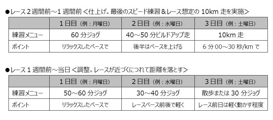 とはいえ、トレーニングで必ずしも本番と同じ距離を走る必要はありません。30km走ができれば何よりですが、少なくとも20~25kmをしっかり走っておけば十分と考えられます。次項では具体的な練習メニューを記載しますので、週間スケジュールを立てる際の参考にしていただければと思います。