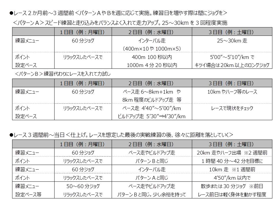 次項で具体的な練習メニューの例を記載しますが、ある程度ランニングの経験があってレースにも出場されている方を想定し、レースの3か月前~2か月前の基礎作り期間は省略し、2か月前以降のメニューを考えたいと思います。