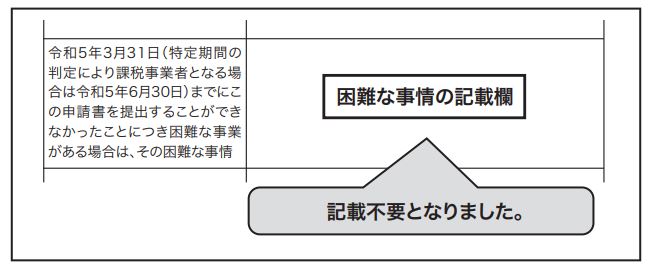 A. 令和5年10月1日から「適格請求書発行事業者」になろうとするときは、原則として令和5年3月31日までに登録申請書を税務署長に提出することとされていましたが、令和5年度改正により、あえて申請書に困難な事情を記載しなくても、令和5年9月30日までの登録申請で、令和5年10月1日からの登録ができることとなりました。