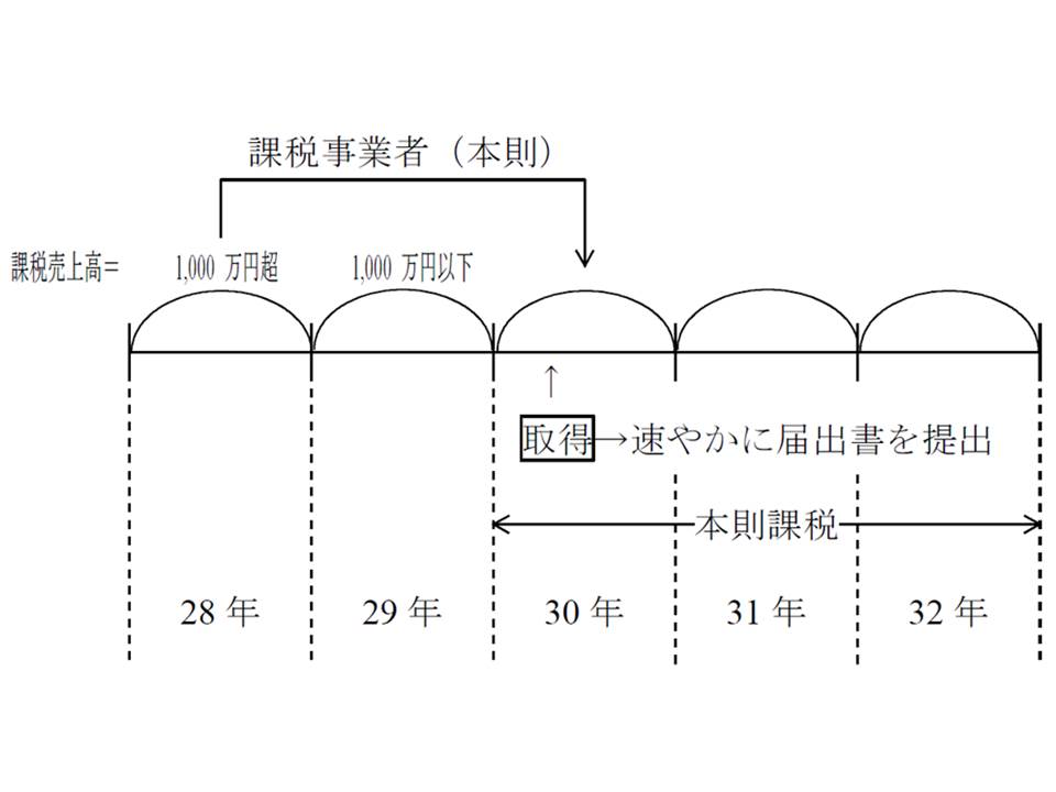 本則課税の適用期間中に高額特定資産を取得した場合には、たとえ平成22年度改正法の適用を受けない場合であっても、いわゆる「3年縛り」の規定が強制適用されることとなりました(消法12の4・37③、消令25の5)。したがって、ご質問のケースでは、基準期間である平成29年と平成30年中の課税売上高に関係なく、平成32年までは本則課税が強制適用となります。