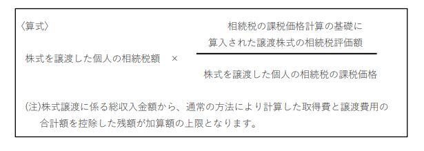 相続または遺贈(以下「相続等」)により非上場株式を含む資産を取得して、相続税が課税されているものが、相続開始のあった日の翌日から相続税の申告書の提出期限の翌日以後3年以内(相続発生後3年10ヶ月以内)に非上場株式などのその相続等により取得した資産を譲渡した場合には、確定申告を要件に譲渡所得の金額の計算上、取得費に次の算式により計算した相続税額のうち一定の金額を加算でき(取得費加算の特例)、結果として課税される譲渡所得の金額が小さくなります。なお、この特例は(1)の特例と併せて適用を受けることができます。