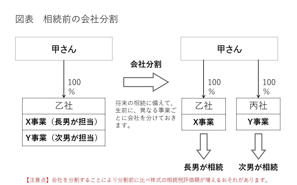上記1の問題点を踏まえれば、甲さんが生前に乙社をX事業、Y事業と事業別に二つに分割しておくことが有効な対策といえます。具体的には、乙社はX事業を営む会社として存続させる一方で、Y事業を営む会社として丙社を会社分割により設立(会社法762条以下。これを「新設分割」といいます。)します。生前にそのような対策を実行することにより、甲さんの相続開始時には相続財産が乙社株式と新たに設立した丙社の株式になります。 この乙社株式と丙社株式を長男と次男兄弟がそれぞれ相続することで、遺産分割とその後の会社経営にかかるトラブルを未然に防ぐことが可能です。また、税務上は、甲さんが生前に上記の会社分割を行い、分割後の乙社株式と丙社株式を相続開始時まですべて保有する予定であり、他に乙社からは何も給付を受けなければ、その他の要件を満たすときには適格分割となるため、課税の問題も生じません(下記3 参照)。