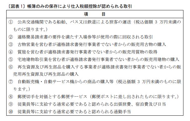 次の〔図表1〕に掲げる課税仕入れについては、その課税仕入れを行った事業者において適格請求書等の保存を要せず、一定の事項が記載された帳簿のみの保存により仕入税額控除をすることができます(新消法30⑦、新消令49①一、新消規15の4、26の6、インボイスQ&A問74、問92)。