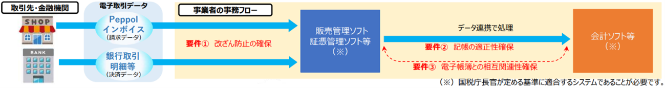 これは、デジタル庁が管理する仕様に従って送受信されたデジタルインボイスや預貯金口座における決済データのいずれかの電子取引について、要件に従って保存ができるシステムのことをいうことになります。すなわちPeppolなどのデジタルインボイスの仕様に基づく電子取引が行うことができる電子計算機処理システムということになります。