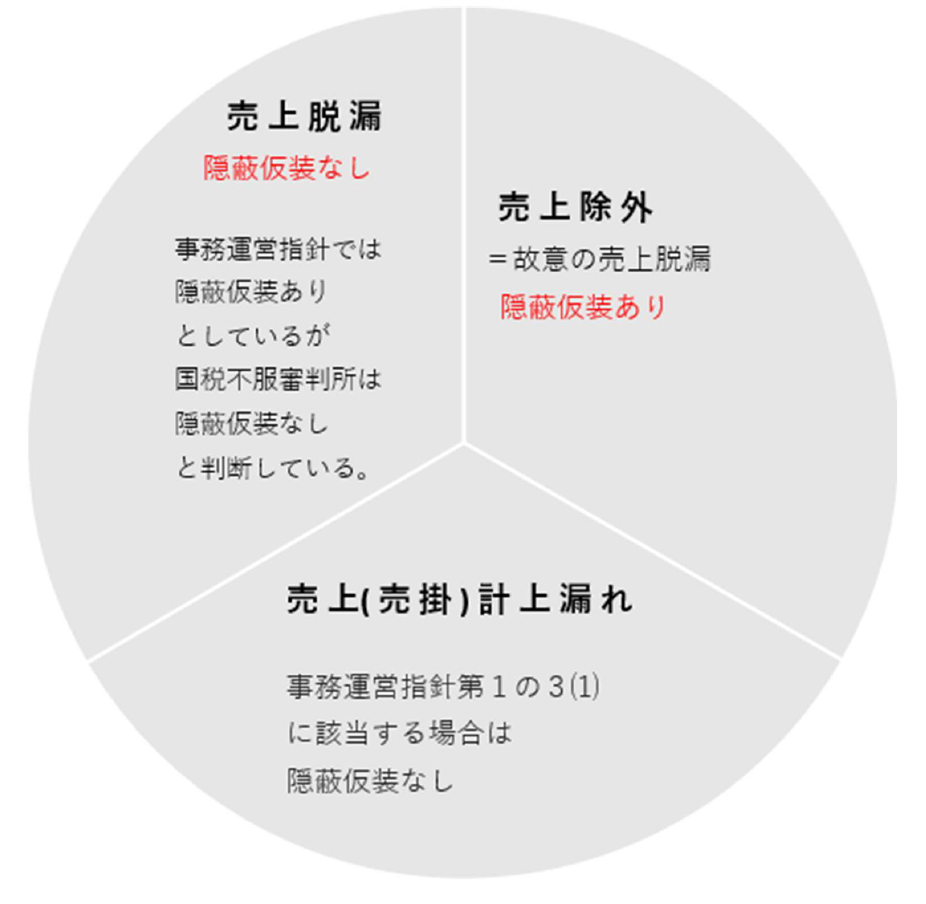 『脱漏』を国語辞書から理解する限り、単に漏れていることであり、意図的に漏らした、との意味にはならない。 つまり、事務運営指針に従えば、売上の脱漏とは、故意がない(すなわち隠蔽・仮装がない)状況でも、重加算税を賦課できることになる。したがって、「売上の脱ろう」と定めた事務運営指針は、国税通則法の重加算税の条文に反している恐れがある。