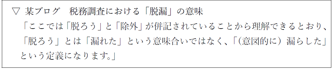 ここで注目したいのは、「売上・・・の 『脱ろう』又は棚卸資産の除外」と表現していることである。脱漏と除外を使い分けているのは何故だろうか。ネットで検索したところ、次の解説があった。
