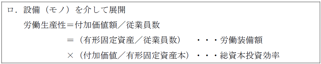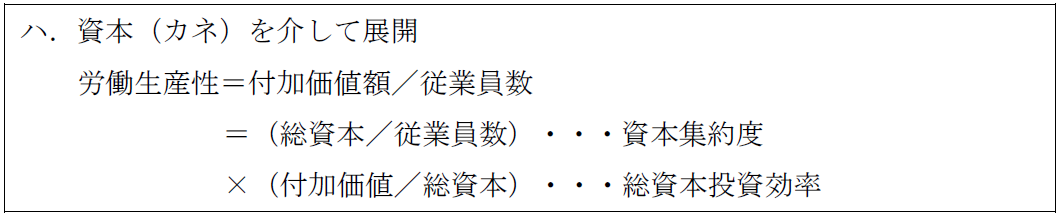 労働生産性を資本(カネ)を介して分解すると、資本がどれだけ従業員一人に対して集約されているのか、そして、その資本がどれだけ付加価値をあげているのかという視点で展開されます。