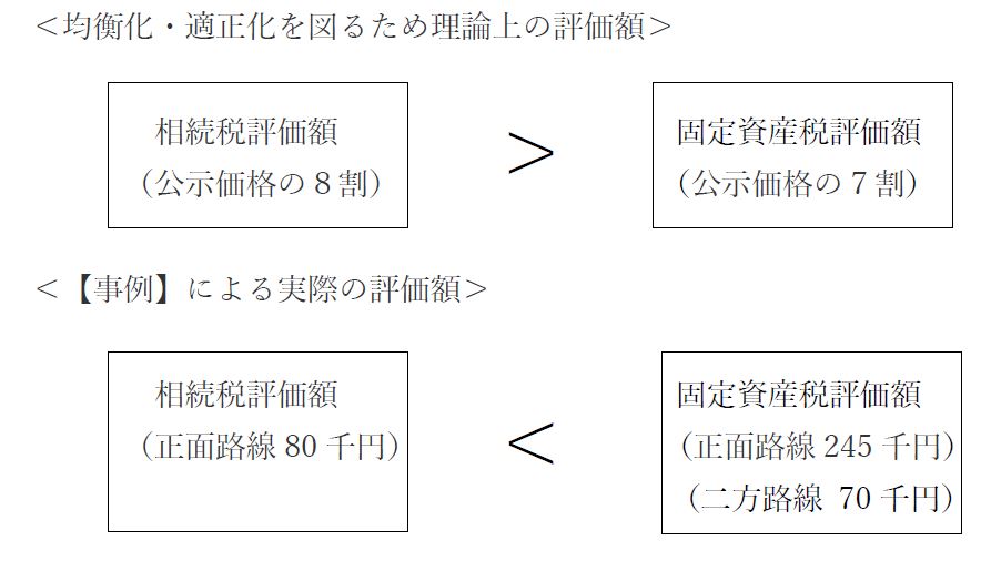 土地評価の均衡化・適正化を図るため基本的に相続税評価額は公示価格の8割、固定資産税評価額は公示価格の7割で評価されるよう図られており、それぞれの路線価もこの8割及び7割の割合に基づき価格設定されています。