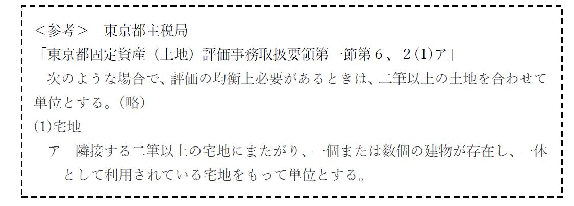 それでも外形上一見明白に一体をなしていれば他者の土地も含め1画地として評価する固定資産税の評価方法は、行政実務だけを考慮したもので、時価に基づく評価という点では明らかに問題があると考えます。