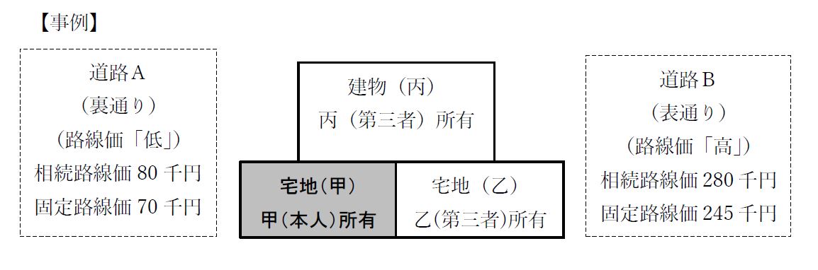 【事例】において、相続税では宅地(甲)のみを評価単位とすることから正面路線は「道路A」となります。したがって、裏通りの路線価80千円という比較的低い正面路線価によることから、算定される相続税評価額は比較的低い価額となります。
