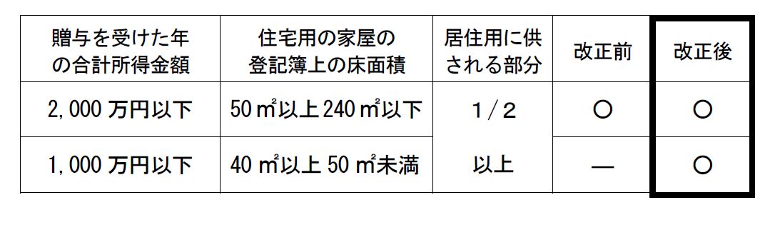 令和3年1月1日以降の贈与については、合計所得金額が1,000万円以下の場合に限り、取得住宅の登記簿上の床面積が40㎡以上(現行は50㎡以上)で本制度の適用対象となりました。