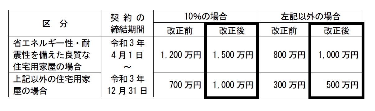 令和3年4月1日から同年12月31日までの間に住宅用家屋の新築等に係る契約を締結した場合における非課税限度額を、令和2年4月1日から令和3年3月31日までの間の非課税限度額と同額まで引き上げられました。