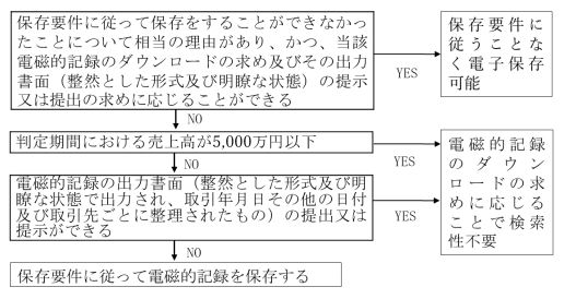 納税地等の所轄税務署長が当該電子取引の取引情報に係る電磁的記録を保存要件に従って保存することができなかったことについて相当の理由があると認め、かつ、質問検査権に基づく当該電磁的記録のダウンロードの求め及び当該電磁的記録の出力書面(整然とした形式及び明瞭な状態で出力されたものに限る。)の提示又は提出の求めに応じることができるようにしている場合には、その保存要件に関わらず、その電磁的記録の保存をすることができることとされました。