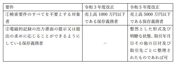 従来、売上高1000万円以下という極めて小規模の事業者にしか検索要件不要という措置は適用されていませんでしたが、売上高5000万円まで拡大されたことで、電子ファイル保存システムなどを導入してもコスト倒れになる規模の事業者への配慮が進んだことになります。