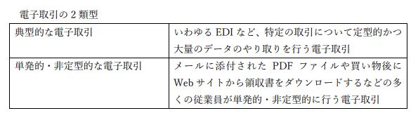 電子取引は、注文書、納品書、請求書などを書類として出力し・郵送するのではなく、注文データ、納品データ、請求データといった電子的にやり取りする取引方式です。EDI(Electronic Data Interchange)と呼ばれることもあります。電子帳簿保存法の中では特に分類はないものの、筆者は、電子取引を2つに区分して考えると理解がしやすいと考えています。
