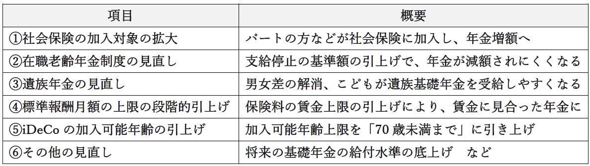 主な改正内容として、①社会保険の加入対象の拡大、②在職老齢年金制度の見直し、③遺族年金の見直し、④標準報酬月額の上限の段階的引上げ、⑤iDeCoの加入可能年齢の引上げ、⑥その他(将来の基礎年金の給付水準の底上げなど)が盛り込まれています。