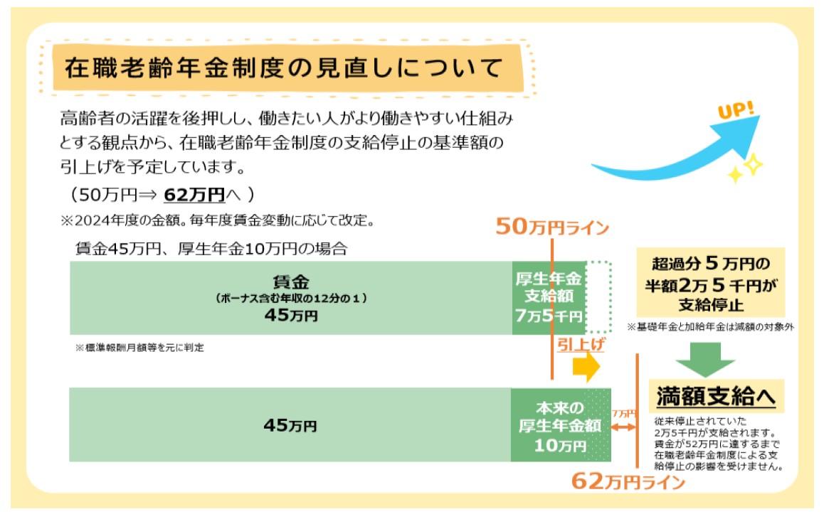 支給停止の基準額が、現在51万円から「62万円」に引上げられます。