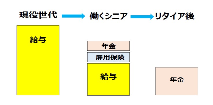 サラリーマンの方の場合、収入の基本は、現役世代は「給与」、シニアになると「給与+雇用保険+年金」、リタイア後は「年金」になります。