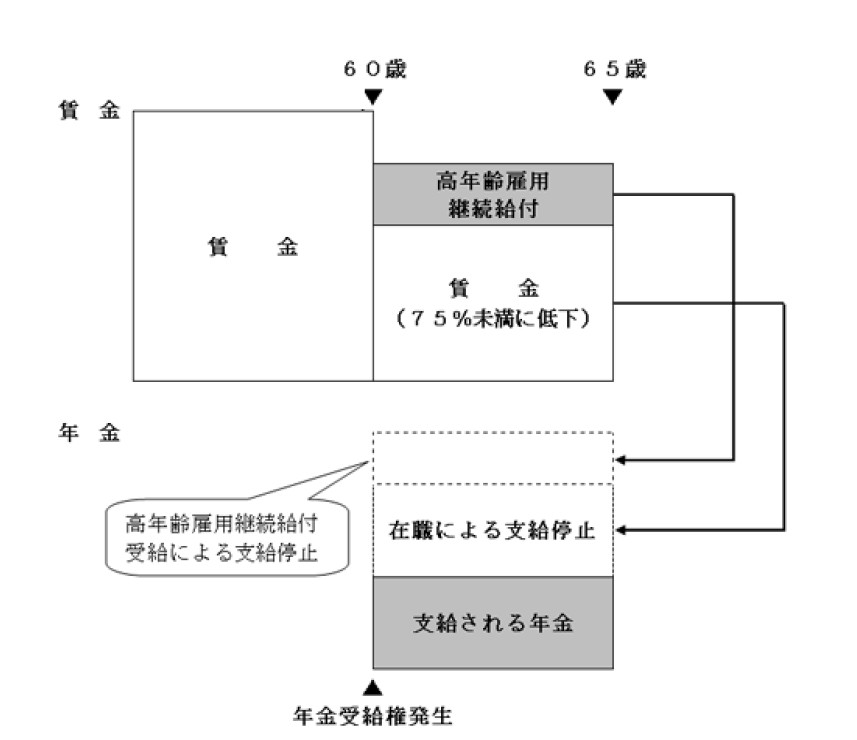 ・厚生年金の被保険者で、年金を受けている場合、雇用保険の「高年齢雇用継続給付」を受けるときは、在職老齢年金と加えて年金の一部が支給停止されます。