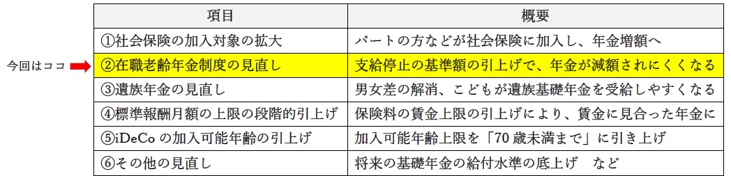 前回も見ましたが、年金制度改正の概要は以下のとおりで、在職老齢年金は②になります。まず、今回の改正ポイントを見ていきましょう。