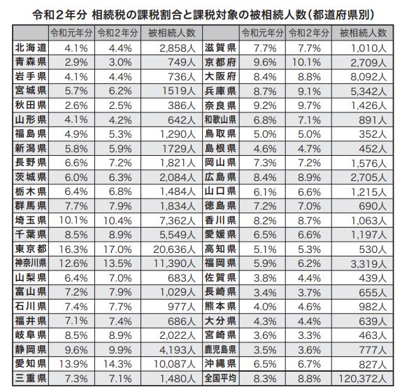 国税庁の公表によると、令和2年分の相続税の課税割合は8.8%(前年分8.3%)となった(令和3年11月1日までに提出された申告書に基づき作成)。