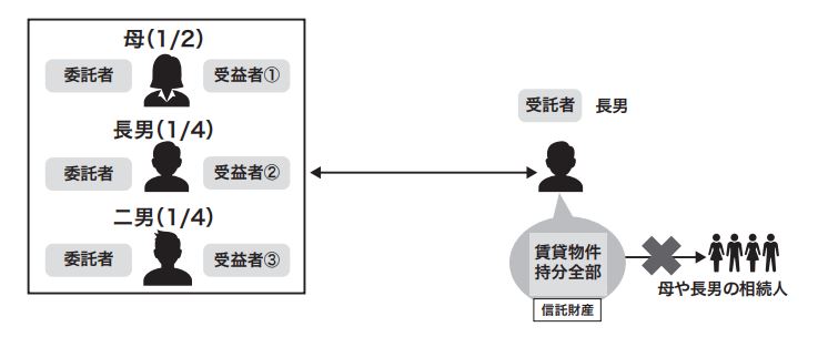 こういった場合に、共有者全員が自らの持分を対象として一人の受託者(たとえば、長男)との間で信託契約を締結すれば、以後、長男が単独所有者としてその賃貸物件を管理することになります。母の同意は不要になります。