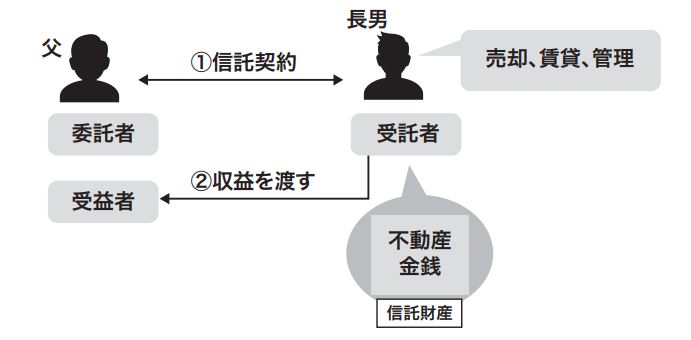 そこで、家族内で高齢になった父母の財産管理ができるようにしたいとのニーズに応えるものとして民事信託が利用されます。信託を利用すれば、譲渡税や贈与税の負担なく財産の権利・名義を子などに移すことができます。たとえば、高齢の父が有する賃貸物件や金銭を対象にし、父と長男との間で信託契約を結ぶことにより、以後、長男がその不動産の所有者かつ預金名義人となり、不動産の売却や賃貸、口座の管理を行うのです。長男への報酬の有無は契約で定めます。
