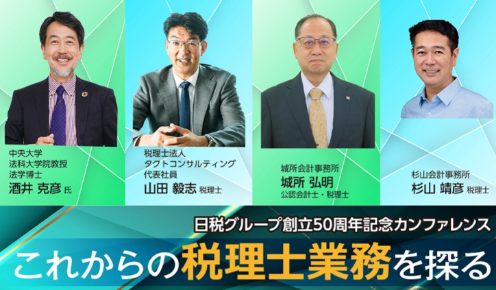 そこで、「これからの税理士業務を探る~DX・相続・事業承継~」をメインテーマに4人の著名な講師陣を迎え、日税グループ創立50周年記念カンファレンス 無料オンラインセミナーを開催しております!