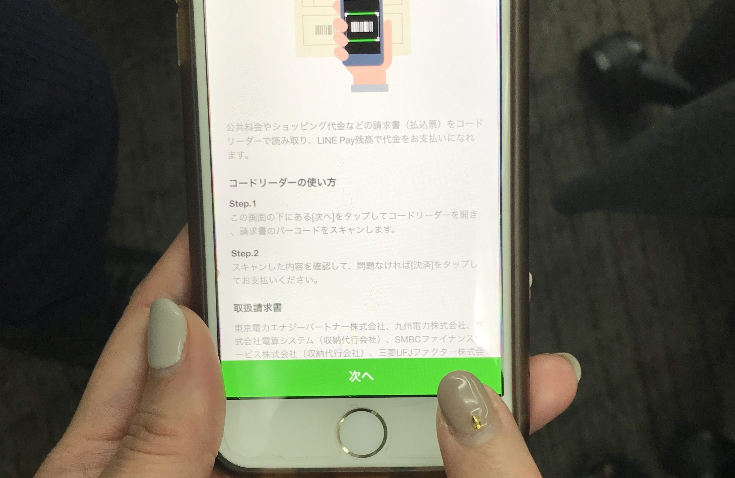 ④「請求書支払い」の画面が表示されるので「次へ」をタップ。
