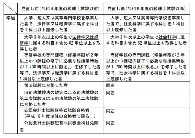 ・税法に属する試験科目(所得税法、法人税法、相続税法、消費税法または酒税法、国税徴収法、住民税または事業税、固定資産税)の受験資格のうち学識による受験資格が、次のとおり拡充される。