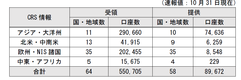 国税庁はこのほど、CRS(Common Reporting Standard:共通報告基準)に基づく非居住者金融口座情報の自動的情報交換を開始し、その初回交換の状況を公表した。