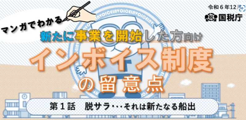 まず、「マンガでわかる 新たに事業を開始した方向けインボイス制度の留意点 ~第1話 脱サラ・・・それは新たなる船出」というタイトルのマンガを掲載。脱サラしてフリーランスとなる人が登場し、新たに事業を開始する際のインボイス登録方法や、インボイスの交付の仕方などのポイントを分かりやすく解説している。