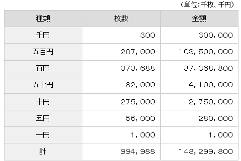 平成31年度の貨幣と日本銀行券の製造枚数を決定 2019/04/08 財務省はこのほど、平成31年度の日本銀行券の製造枚数ならびに貨幣の製造枚数を公表した。 平成31年度の貨幣製造計画は下記のとおり。 「千円貨」は、2020年東京オリンピック・パラリンピック競技大会記念貨幣(第二次発行分30万枚)で、「百円貨」は、2020年東京オリンピック・パラリンピック競技大会記念貨幣(第二次発行分2,368万8千枚)が含まれる。 また、平成31年度日本銀行券製造計画は下記のとおり。 TwitterFacebookPocketはてブLINELinked in