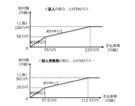 給付額は、申請時の直近の支払家賃(月額)に基づき算出される給付額(月額)の6 倍( 6 カ月分)を支給。給付率・給付上限額は下図の通り(経済産業省の資料より)。
