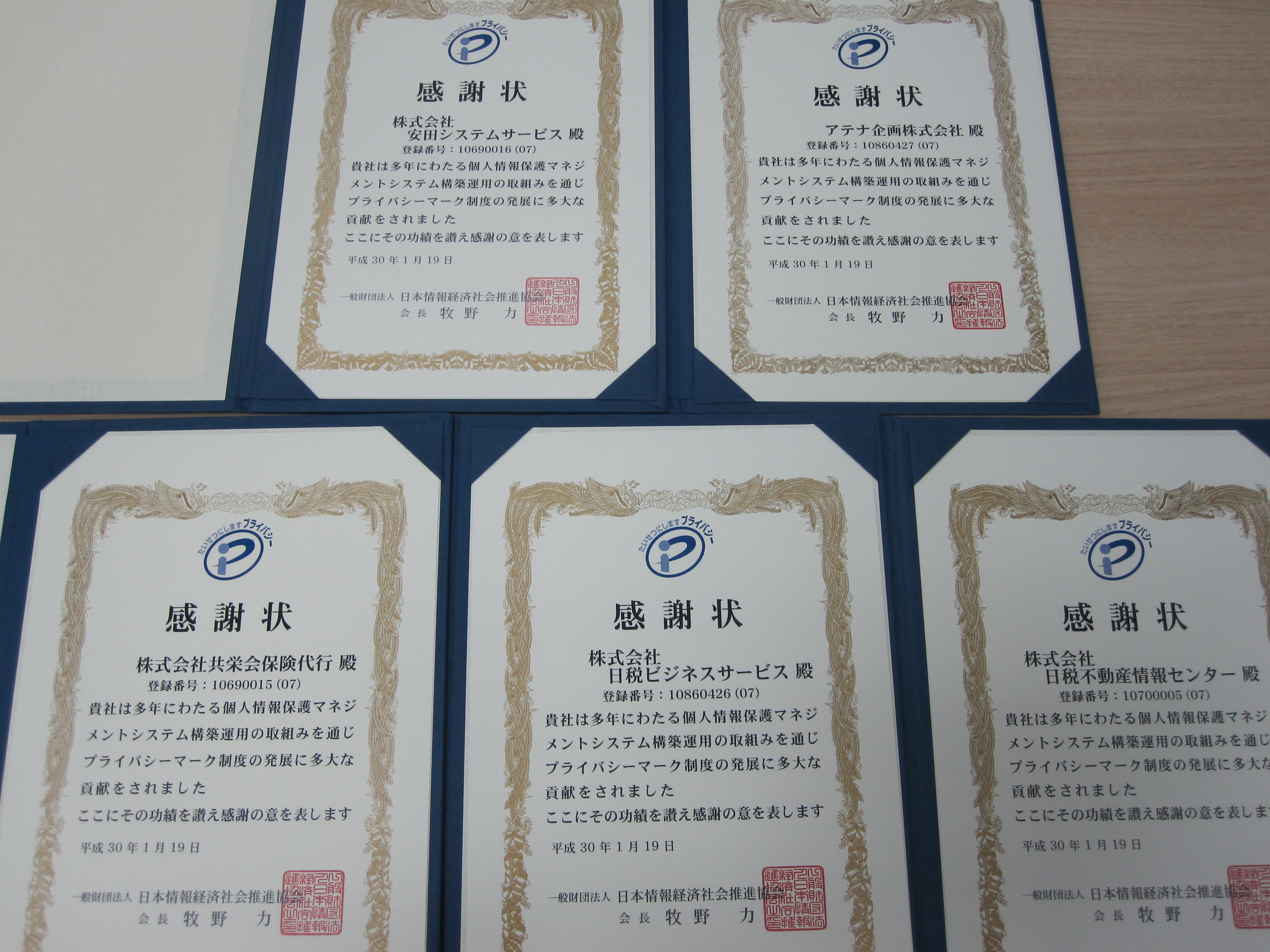 その後もグループ全社で更新申請を継続し、今回、㈱日税ビジネスサービス、㈱日税不動産情報センター、㈱共栄会保険代行、㈱安田システムサービス、アテナ企画㈱の5社が7回目の付与を受け、「プライバシーマーク制度貢献事業者」として表彰され、それぞれ感謝状(写真)が贈呈されました(㈱日税サービスは、次回の審査で表彰対象となる7回目を迎えます)。