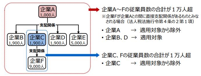 それによると、まず、「『その企業及びその企業との間にその企業による支配関係がある企業の従業員数の合計が1万人を超えるものを除く』とはどういうことか」という質問。