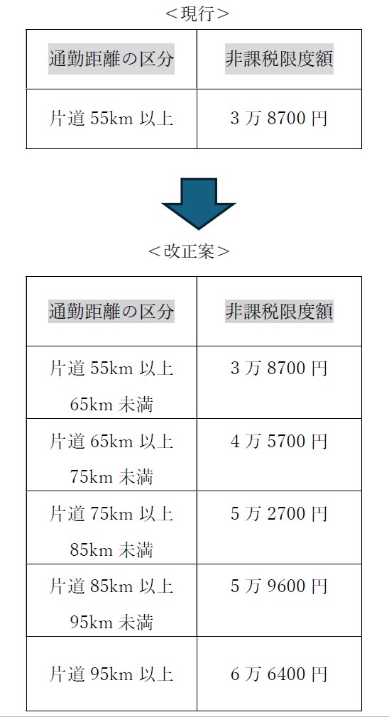 従来、片道55㎞以上の控除額は一律3万8700円とされていたが、表のように新たな通勤距離の区分が設けられた。